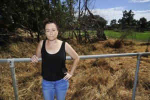Toni Oliver has concerns about the uncut dead grass and the lack of secure fencing along the bridge near the boundary of Westfield Park Primary School. Photograph – Richard Polden.