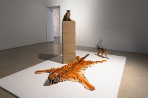The art piece is a tiger skin, three monkeys and boxes which were carved by Mr Abdullah and look realistic with fine details.
