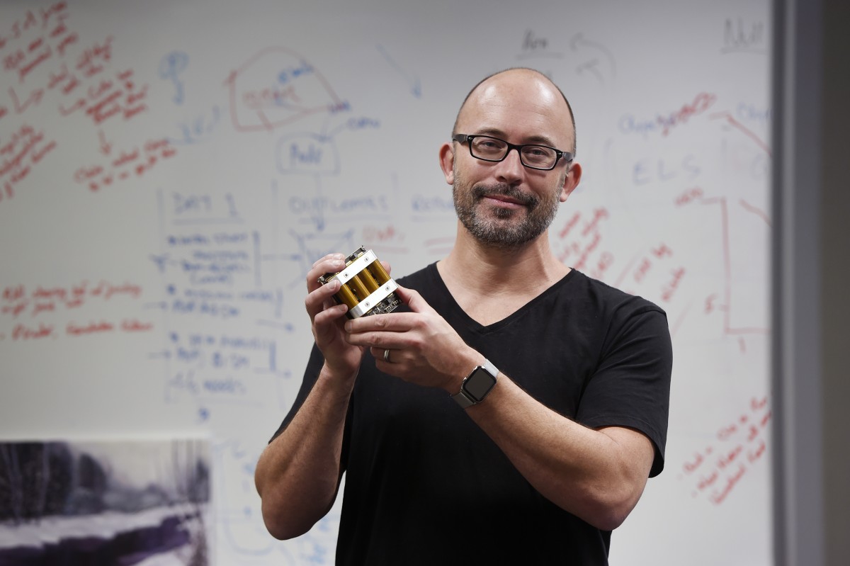 Scientist of the Year 2019 Phil Bland with his mini satellite. Photograph — Richard Polden.