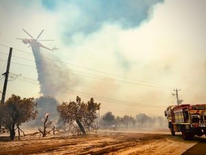 A water bomber and fire truck at the scene of the fire.