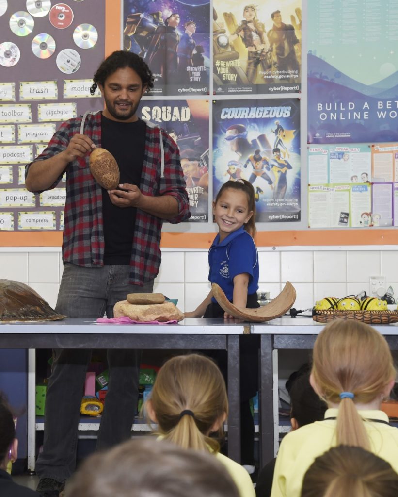 Students at Marri Grove Primary took part in the unique lessons on Tuesday, which saw local father and Wangkatja man Troy Harris visit the school to talk about his Indigenous family history and explore several traditional artefacts.